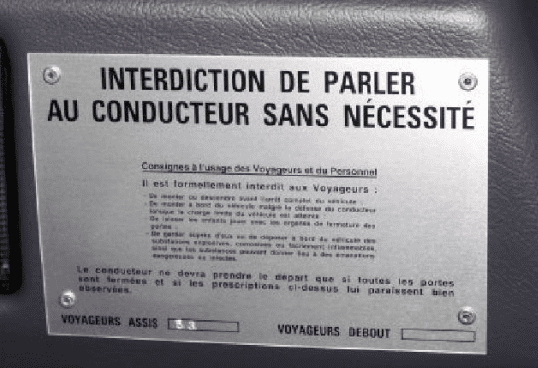 En témoigne la plaque signalétique affichée près du poste de conduite qui s’adresse aux usagers (aussi appelés voyageurs ou passagers) : « Défense de parler au conducteur », qui remplace les glaçoïdes des années 30 (affichettes cartonnées recouvertes d’un simili-émail) fixés auparavant dans les mêmes autobus sur les mêmes réseaux urbains « Défense de parler au chauffeur » pour garantir la concentration et la vigilance du responsable de la sécurité des passagers à bord.